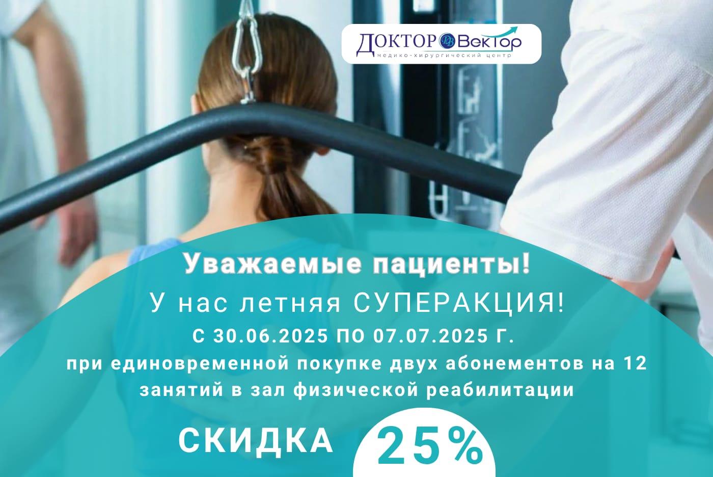 С 30.06.2025 по по 07.07.2025г при единовременной покупке двух абонементов на 12 занятий в зал физической реабилитации скидка 25%!